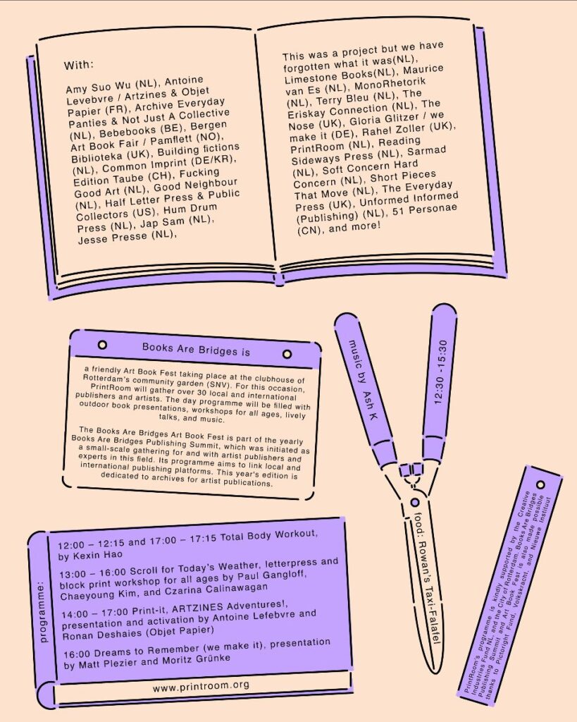 | More information about the Books Are Bridges Publishing Summit: The Books Are Bridges Art Book Fest is an annual event organised within the scope of the Books Are Bridges Publishing Summit. It was initiated as a small-scale gathering for and with artist publishers and experts in this field. Through an in-depth exchange spread over three days, the programme includes presentations, workshops, shared meals, and more. By initiating this gathering, PrintRoom intends to contribute to the support system and network that encompasses publishing practices, initiatives, and spaces. Simply put, this meeting is an occasion to spend qualitative time together, connecting genuinely through showing, telling, making, eating, and conversing around a shared passion for artist publishing. This year’s edition is dedicated to archives for artist publications. Together with kindred spirits from different generations and cultural backgrounds, we take time to intimately explore our collections, discuss our vernacular archiving methods, and reflect on the questions often accompanying our archival practices: How may the archive remain faithful to the intention of a widespread publication while preserving its fragile content? How do we give access to our archives? How can we support archives that are endangered by political crisis or those operating under a fragile economy whose longevity is no longer guaranteed? Special guests in this programme are Mela Dávila Freire (DE/ES), Sam Kim / Common Imprint (DE/KR), Hlib Velyhorskyi / Biblioteka Kyiv (UK/UA), Maike Aden (FR), Marc Fischer / Public Collectors (US), Antoine Lefebvre / Artzines & Objet Papier / Generative Artzines (FR).The Books are Bridges Summit was first initiated in 2022 by Karin de Jong of PrintRoom and Eleanor Vonne Brown of The Nose (and previously X Marks the Bökship, UK). Each programme is developed in close collaboration with the participants. Previous editions were respectively focused on ‘collective practices and art book fairs’ (2022), ‘publishing platforms and network of care’ (2023), and ‘spaces for artist publication’ (2024).The title Books Are Bridges was inspired by the work of Claudia de la Torre (backbonebooks, Berlin). |